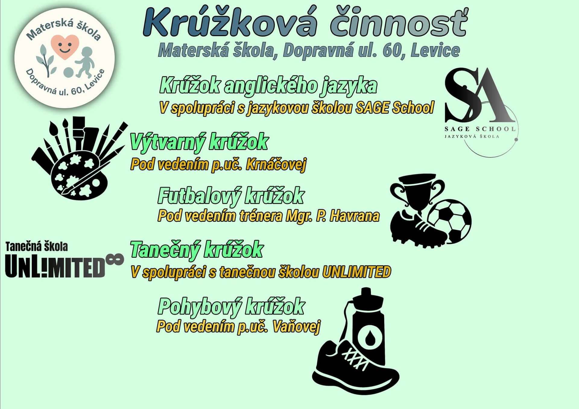 Naša materská škola ponúka bohatú krúžkovú činnosť pod vedením profesionálnych lektorov a skúsených trénerov, ktorí pristupujú k deťom s rešpektom, trpezlivosťou a individuálnym prístupom. Krúžky sú zamerané na rozvoj pohybových zručností, kreativity, logického myslenia aj sociálnych schopností detí. Prostredníctvom hravých a veku primeraných aktivít podporujeme zdravý životný štýl, sebavedomie a radosť z objavovania nových schopností. Našim cieľom je vytvoriť podnetné, bezpečné a láskavé prostredie, v ktorom môže každé dieťa prirodzene rozvíjať svoj talent a záujmy.